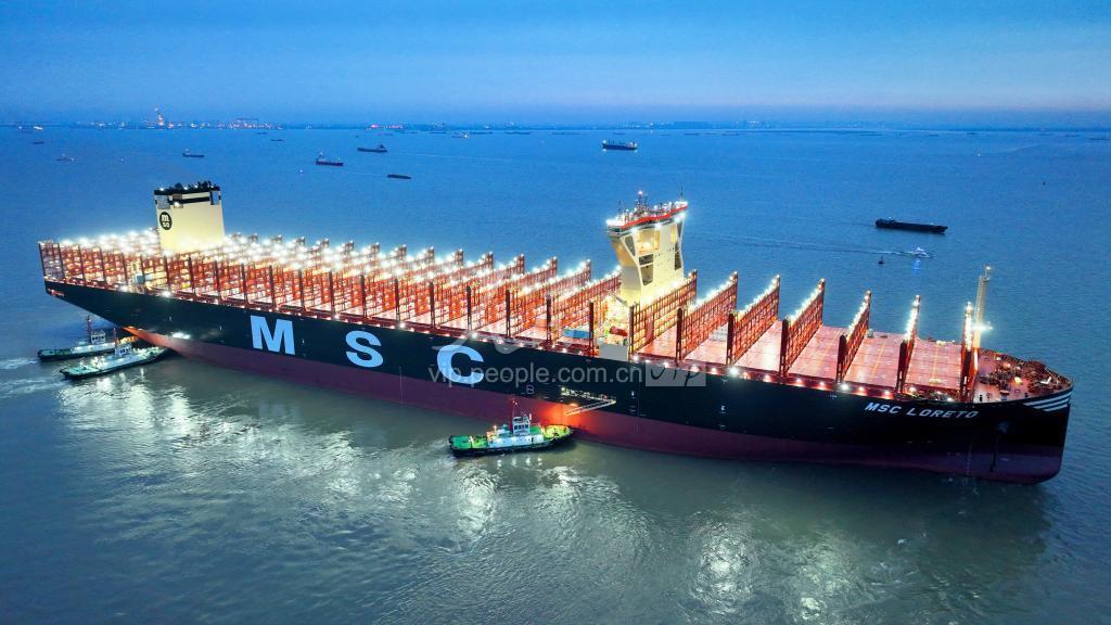 2023年3月19日凌晨5时许,全球最大新造集装箱船“鑫福103”轮驶离江苏省太仓港经济技术开发区扬子三井造船有限公司码头,驶往浙江海域开启试航。