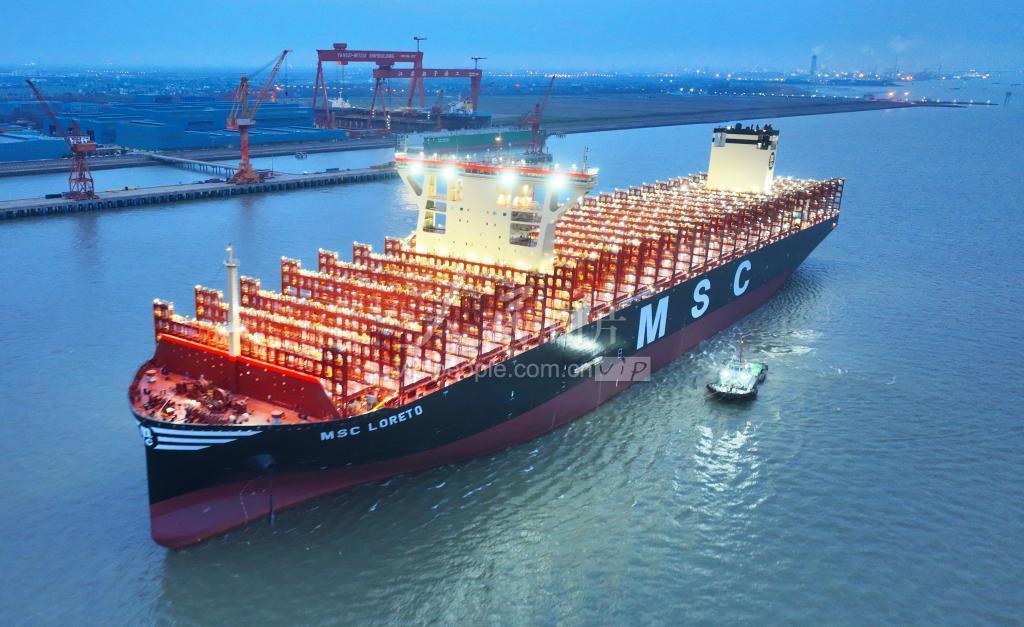2023年3月19日凌晨5时许,全球最大新造集装箱船“鑫福103”轮驶离江苏省太仓港经济技术开发区扬子三井造船有限公司码头,驶往浙江海域开启试航。