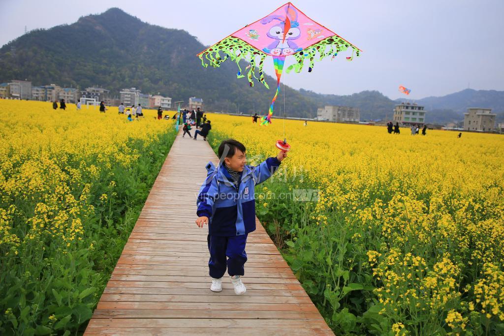2023年3月18日,浙江省玉环市沙门镇油菜花竞相绽放,小朋友在油菜花田中放风筝。