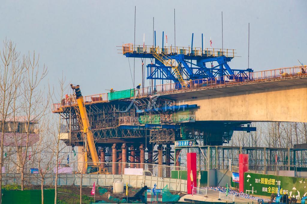 2023年3月19日,江苏省宿迁市宿豫区仰化段京杭运河特大桥施工现场一片繁忙,施工单位正在按照工程进度有序推进大桥建设。