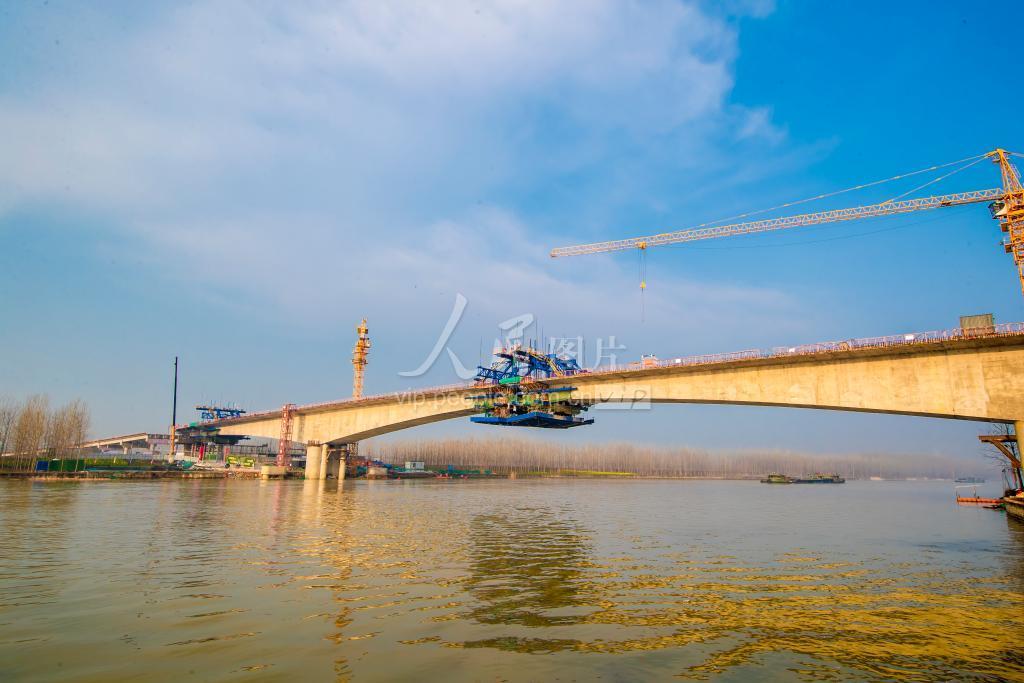 2023年3月19日,江苏省宿迁市宿豫区仰化段京杭运河特大桥施工现场一片繁忙,施工单位正在按照工程进度有序推进大桥建设。