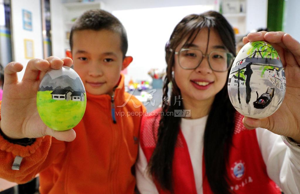 2023年3月19日,河北省秦皇岛市海港区西港路街道万和城社区志愿者和小朋友展示绘制的彩蛋。