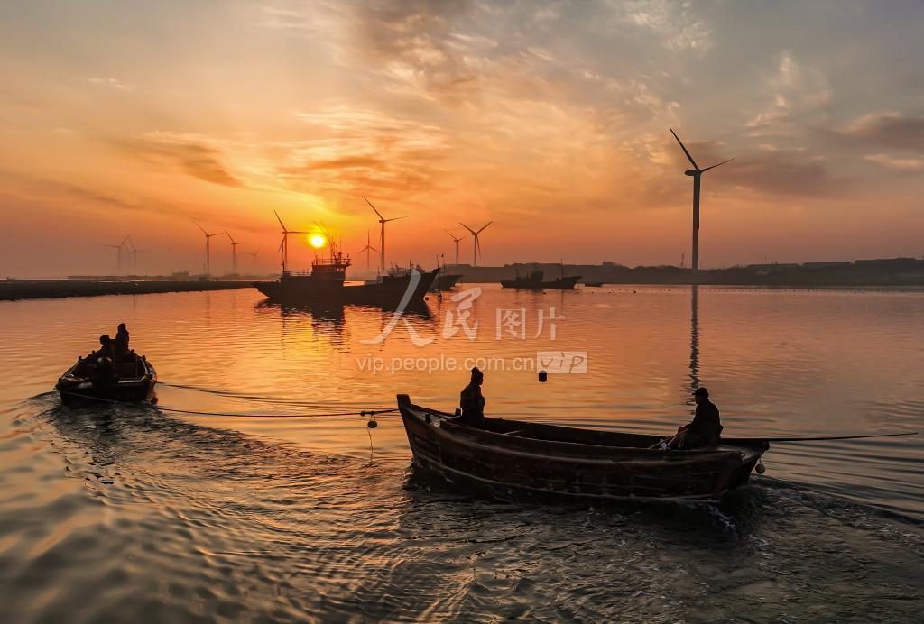 2023年3月19日,在山东省荣成市桑沟湾海洋牧场周边的风力发电场,风力发电机与朝霞、旭日交相辉映,构成春日里一道靓丽的海上风景线。近年来,山东荣成坚持高质量绿色发展理念,依托沿海丰富的风能资源,在各大海洋牧场周边规划布局海上风电建设项目,推进沿海、海岛风力发电、光伏发电等绿色能源产业和海洋牧场生态养殖快速发展。