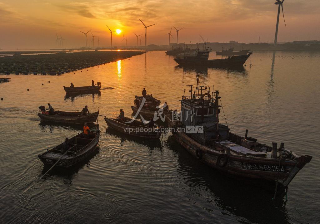 2023年3月19日,在山东省荣成市桑沟湾海洋牧场周边的风力发电场,风力发电机与朝霞、旭日交相辉映,构成春日里一道靓丽的海上风景线。近年来,山东荣成坚持高质量绿色发展理念,依托沿海丰富的风能资源,在各大海洋牧场周边规划布局海上风电建设项目,推进沿海、海岛风力发电、光伏发电等绿色能源产业和海洋牧场生态养殖快速发展。