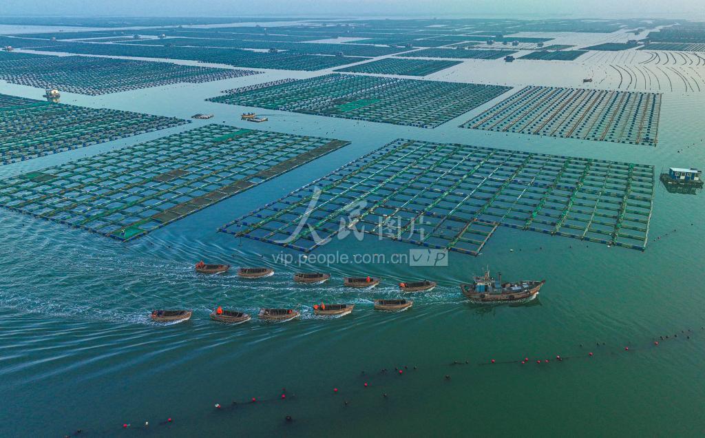 2023年3月19日,在山东省荣成市桑沟湾海洋牧场,渔民们驾驶渔船前往生态养殖区进行作业。