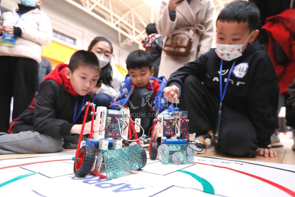 2023年3月19日,山东省青岛市即墨区的学生在参加“铁甲钢拳”项目比赛。