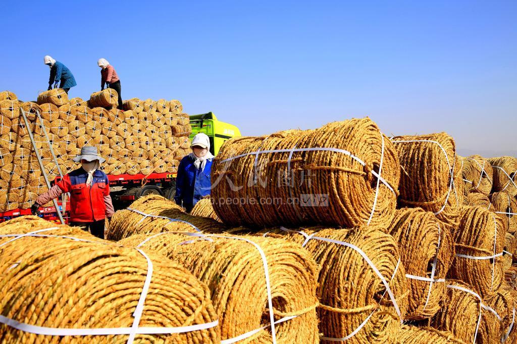 2023年3月29日,在甘肃省张掖市甘州区乌江镇一家稻草制品厂内,村民正在为树苗种植企业装运草绳。
