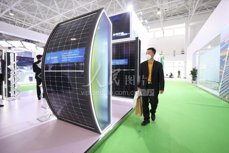 2023年3月29日,参观者在2023中国国际清洁能源博览会暨中国氢能展上边走边看光伏太阳能板。