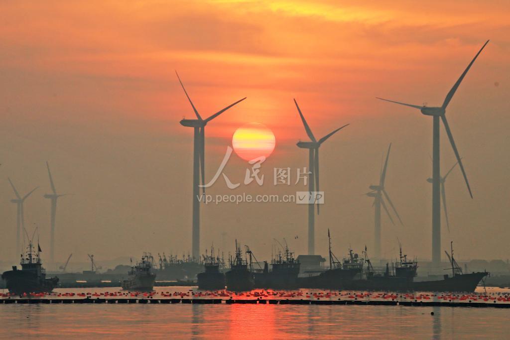 2023年4月3日,在山东省荣成市东褚岛一处风力发电场,风力发电机在运转,与日出、大海相辉映,景美如画。 近年来,山东省荣成市坚持高质量绿色发展理念,依托沿海丰富的风能资源,规划布局海上风电建设,推进沿海、海岛风力发电、光伏发电等,优化能源结构,推进碳达峰、碳中和,实现生态保护和可持续发展。