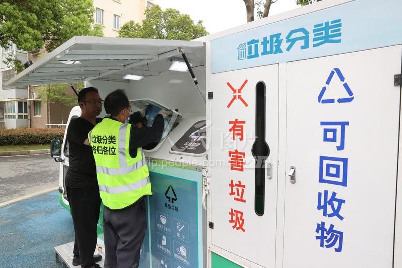 2023年4月4日,江苏无锡,居民在梁溪区尤渡社区尤渡苑小区将分类好的垃圾投入流动收集车。江苏省无锡市梁溪区广益街道尤渡社区区针对老旧小区垃圾分类定时投放点选址难的问题,定制一批集宣传、存放、运输功能于一体,兼具有占地面积小、移动灵活等特点的垃圾分类流动收集车,投放在小区内,有效解决垃圾分类工作中遇到的痛点问题。通过“固定投放点+流动收集车”的模式,节省空间、降低垃圾分类房对居民居住环境等的影响,方便垃圾收集转运。