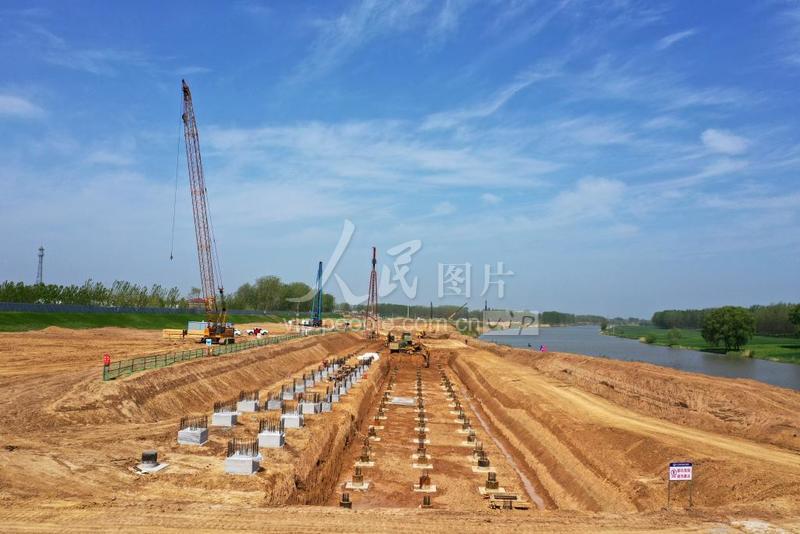 2023年4月10日,安徽省亳州市蒙城县涡河蒙城港区建设工程一期项目现场,工人及大型机械正在忙碌地施工作业。