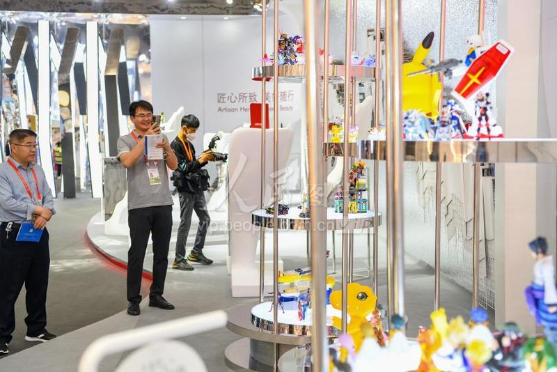 2023年4月10日,在海南省海口市海南国际会展中心王府井集团展厅,参展人员正在拍摄展厅内的各类手办和卡通玩偶。