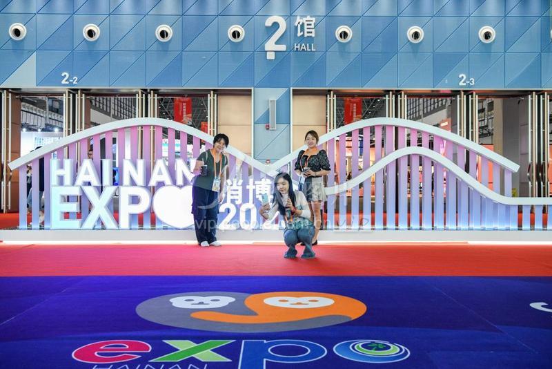 2023年4月10日,在海南省海口市海南国际会展中心,参展人员在消博会展馆前打卡留念。
