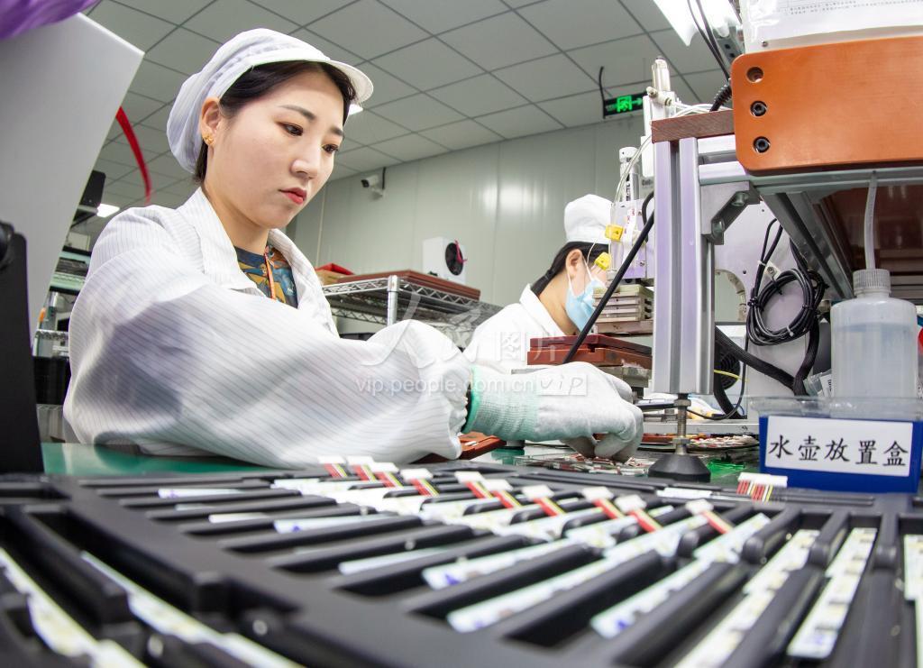 2023年4月12日,位于江苏省海安高新区台商产业园的加百裕(南通)电子有限公司车间内,工人正在赶制供应国内外市场的锂电池产品。
