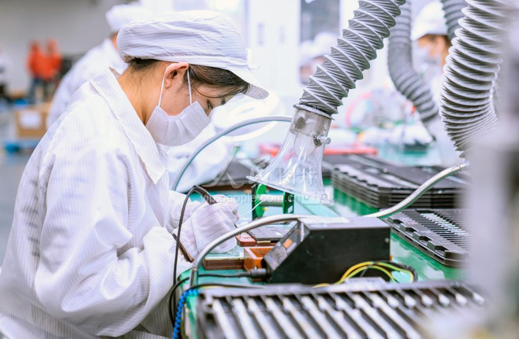 2023年4月12日,位于江苏省海安高新区台商产业园的加百裕(南通)电子有限公司车间内,工人正在赶制供应国内外市场的锂电池产品。