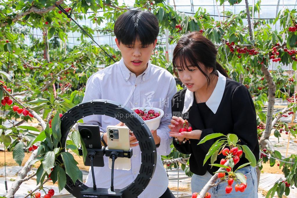 2023年4月18日,山东省淄博市淄川区西河镇南坪村樱桃种植基地,山东水利技师学院学生正在直播助农销售樱桃。 眼下正值樱桃采摘时节,山东水利技师学院信息技术系电子商务专业电商助农直播团队师生,走进淄川区西河镇南坪村樱桃种植基地,通过网络直播带货,帮助村民销售樱桃,促进农民增收,助力乡村振兴。