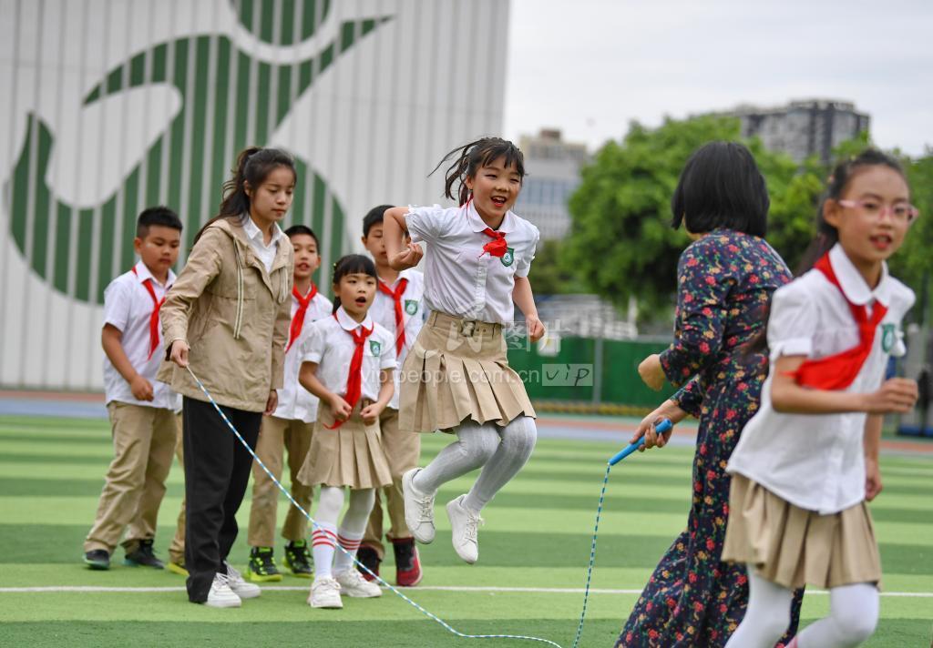 4月23日,在成都高新区菁蓉小学操场上,小学生正在跳绳