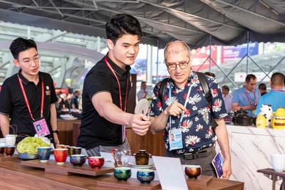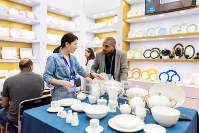 4月24日,在广州市琶洲馆举办的第133届中国进出口商品交易会第二期现场,埃及采购商穿梭在德化陶瓷展区与业务员洽谈。