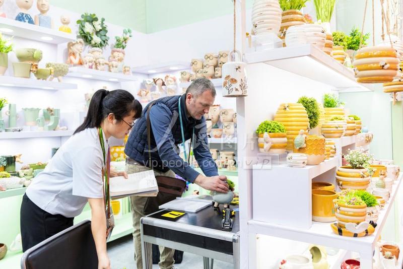4月23日,在广州市琶洲馆举办的第133届中国进出口商品交易会第二期现场,外国采购商在德化陶瓷展区采购陶瓷,达成不少意向订单。