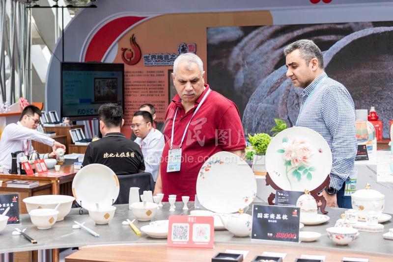 4月23日,在广州市琶洲馆举办的第133届中国进出口商品交易会第二期现场,外国采购商穿梭在德化陶瓷展区,欣赏、体验德化陶瓷企业的最新产品。