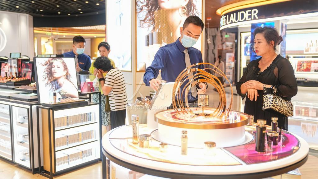 2023年5月1日,在海口日月广场海控全球精品免税城内,消费者选购免税商品。 “五一”节期间,海口各大免税店线上、线下推出折扣、满减、返券、发放现金券等优惠促销活动,多措并举激发离岛免税消费热情。