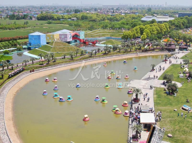 2023年5月1日,游客在江苏省南通市通州区先锋镇的南通洲际绿博园乘坐小游船。