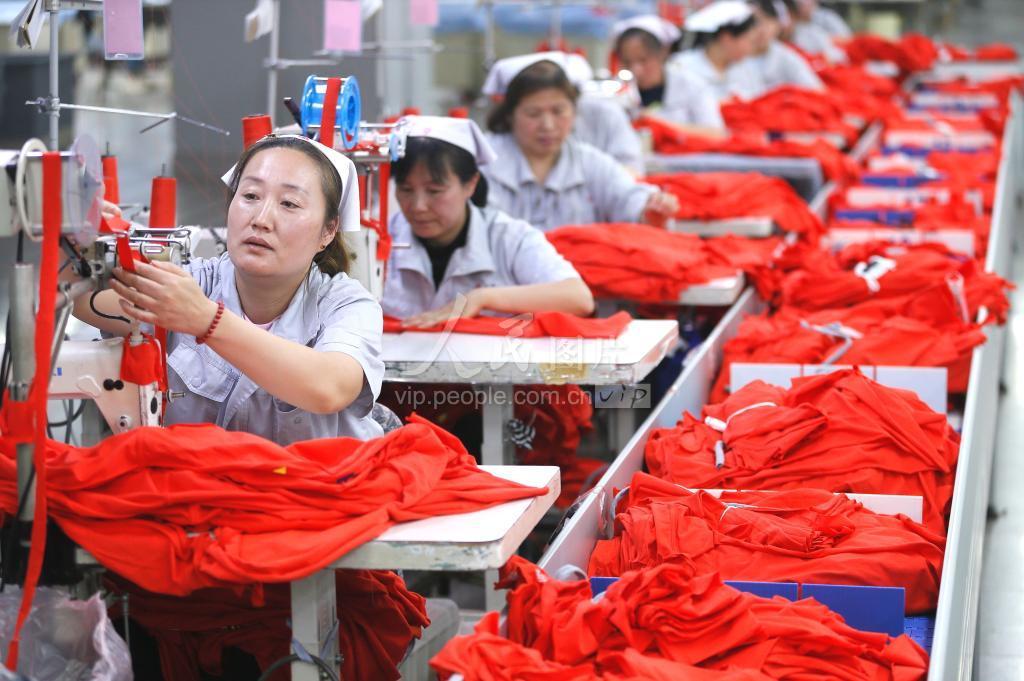 2023年5月4日,山东省青岛市即墨区即发集团有限公司的缝纫工人在生产出口到海外市场的服装产品。