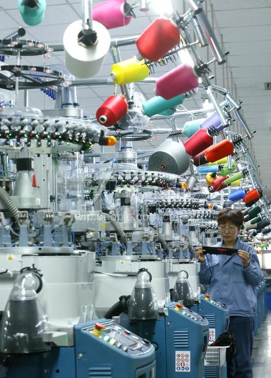 2023年5月4日,在山东省青岛市即墨区的青岛华盛袜业有限公司,制袜工人在生产出口到海外的产品。