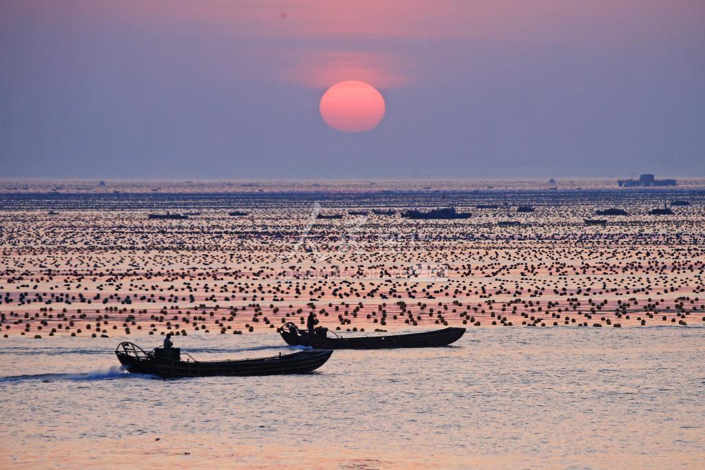 2023年5月9日,在山东省荣成市爱伦湾海洋牧场,养殖船迎着日出出海作业。