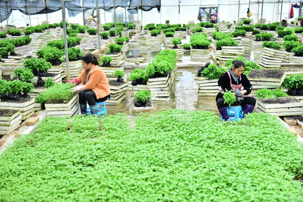 2023年5月9日,贵州省黔东南苗族侗族自治州从江县丙妹镇长滩村辣椒种植专业合作社的农民在秧苗基地分选辣椒苗。