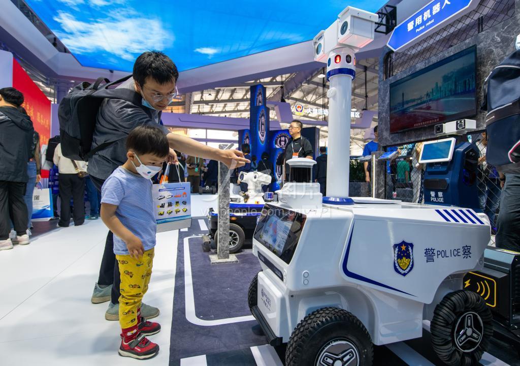 5月11日,在警博会上,一位父亲正在给孩子介绍警用机器人。