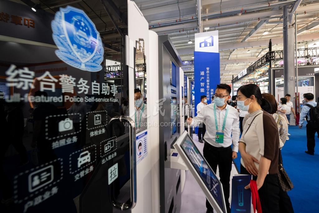 5月11日,参展商正在介绍演示全警通“一站式”自助办理设备。