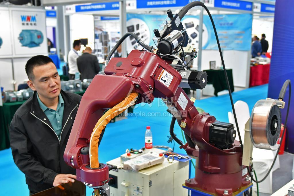 2023年5月11日,参观者在第二十一届烟台国际装备制造业博览会上了解一款焊接机器人。