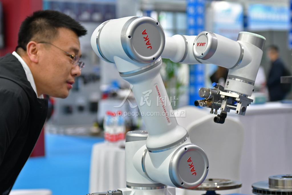 2023年5月11日,参观者在第二十一届烟台国际装备制造业博览会上了解一款工业机械臂。