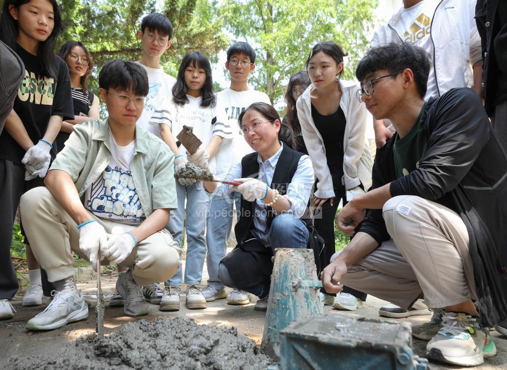 2023年5月12日,江苏淮安,淮阴师范学院城环学院工程造价专业的大学生在实训课上搬砖,砌墙。老师带领同学们在课堂上搅拌砂浆,砌不同形状的墙体,做混凝土坍落度试验等,旨在通过实践让同学们掌握各种材料的技术性能,提高对常用的材料具有独立进行质量检验的能力。