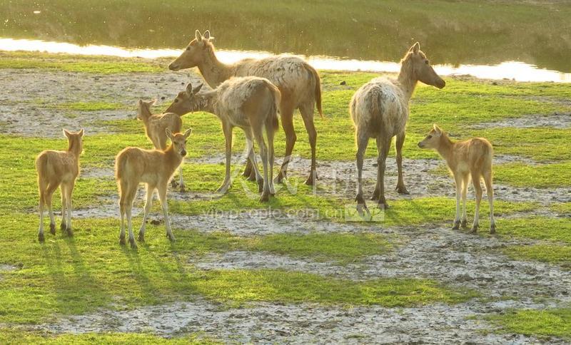 2023年5月15日,初夏时节的江苏大丰麋鹿国家级自然保护区黄海野鹿荡滩涂湿地水草丰美、生态环境优美,成群的麜鹿在湿地嬉戏、觅食。其中不少是刚出生不久的仔鹿。