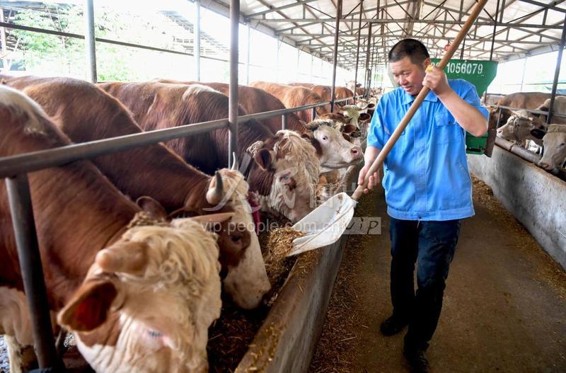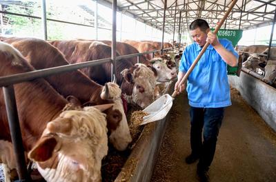 2023年5月16日,在安徽省亳州市利辛县中疃镇保华养殖场,工人在喂牛。 初夏时节,在安徽省亳州市利辛县中疃镇黄井社区的保华养殖场内,一头头肉牛膘肥体壮。据养殖场负责人介绍,养殖场每年出栏肉牛2000多头,带来经济收入近千万元。 近年来,亳州市利辛县结合当地秸秆丰富的优势,坚持党建引领,采取“养殖场+企业+农户”的模式,全力打造以中疃、望疃、阚疃、潘楼、张村、城北为中心的6个黄牛养殖小镇,形成从繁育、养殖到屠宰、加工的全产业链体系,推动全县肉牛产业高质量发展,助力乡村振兴。