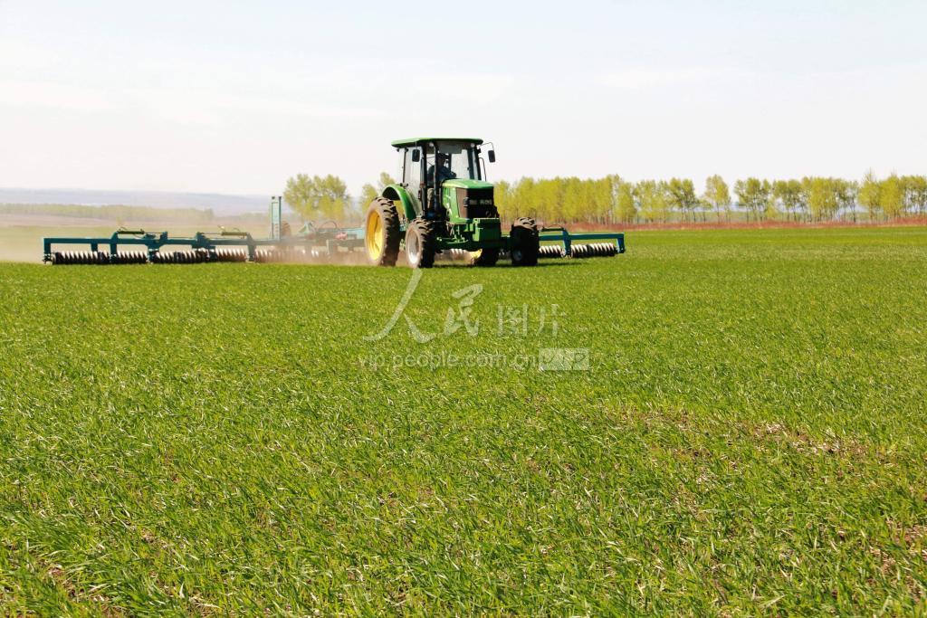 2023年5月17日,黑龙江黑河北大荒集团公司五大连池农场有限公司工人驾驶机车正在进行小麦压青苗作业。