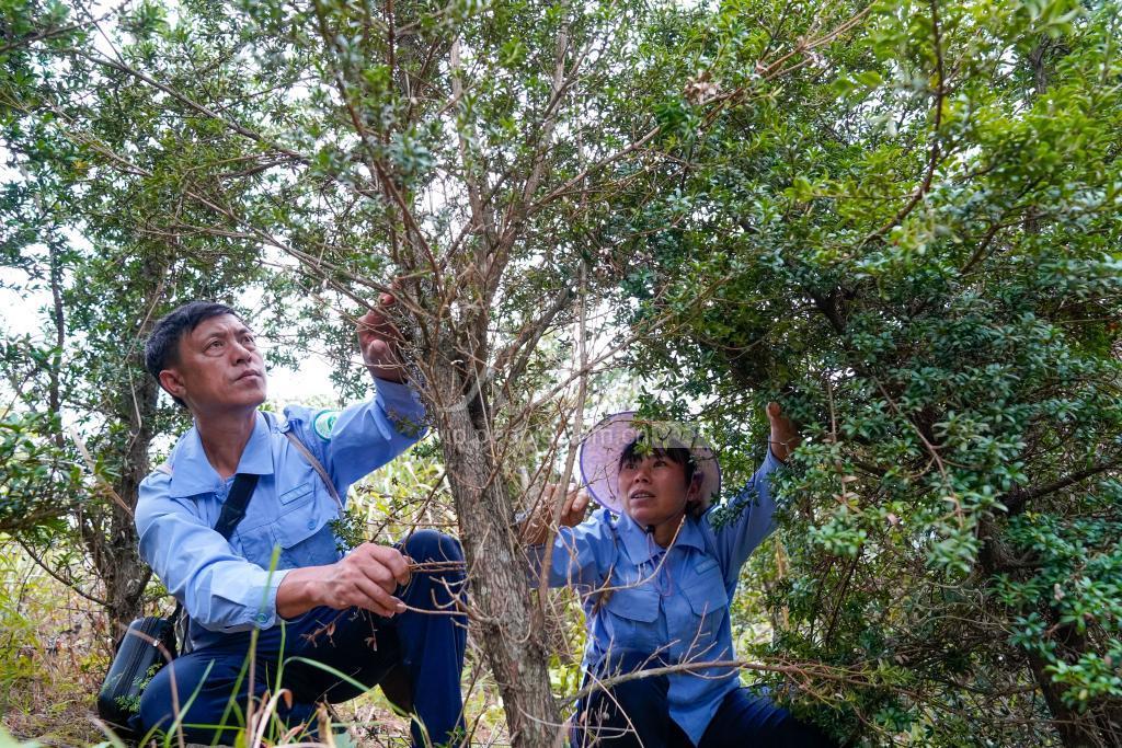 2023年4月19日,黄通甫夫妇在龙道山护林点查看国家二级保护植物罗汉松生长情况。