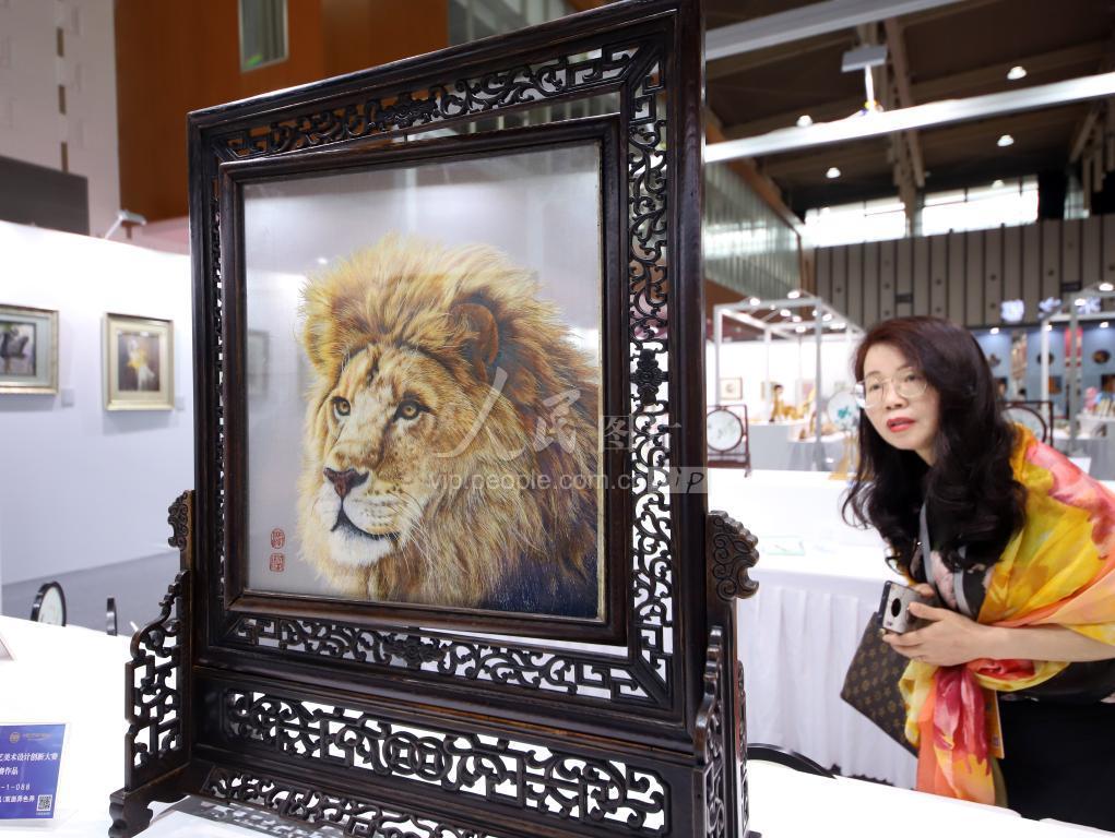 2023年5月26日,观众在第三届中国工艺美术博览会参观双面异色异样绣展品。