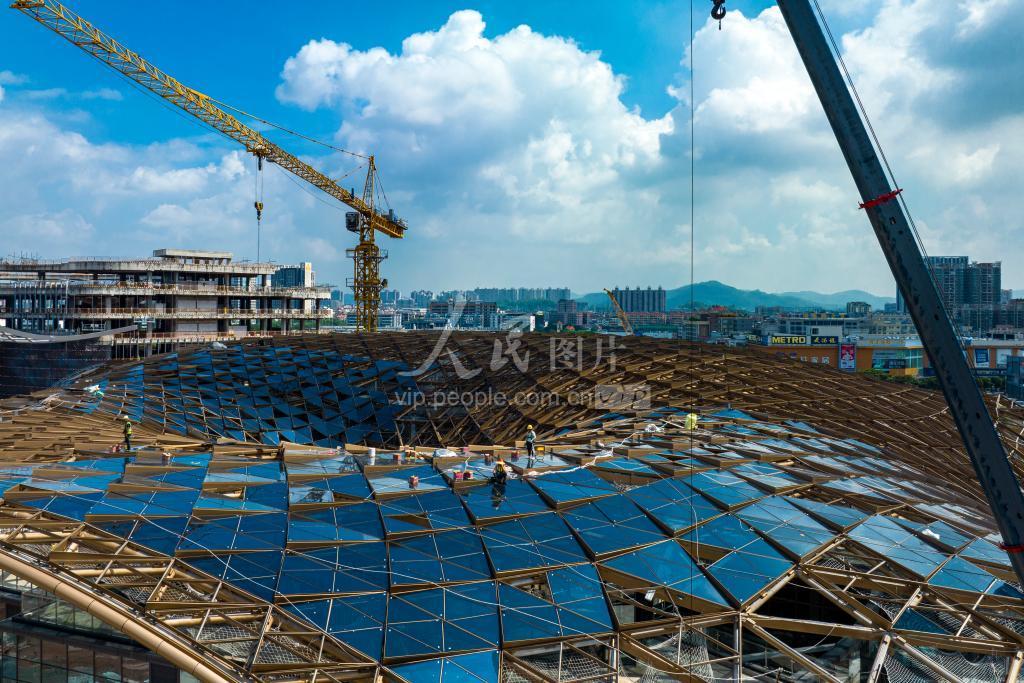 2023年5月27日,位于广东省广州市天河区的广州国际金融城工地,工人正在交通枢纽屋顶开展幕墙作业。
