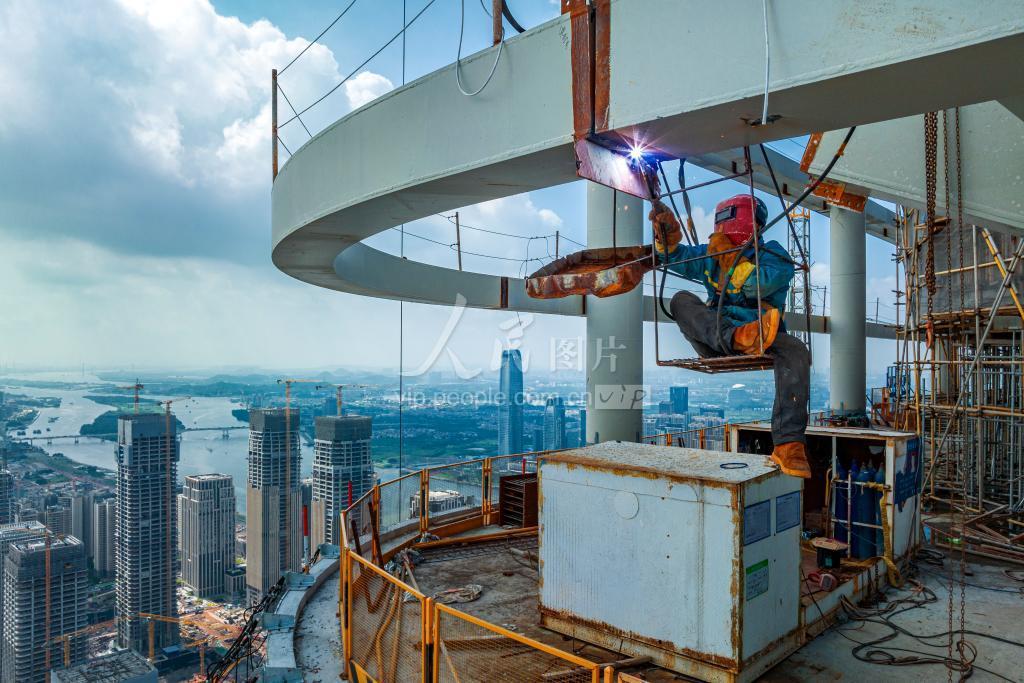 2023年5月27日,位于广东省广州市天河区的广州国际金融城工地,工人在高空钢构作业。