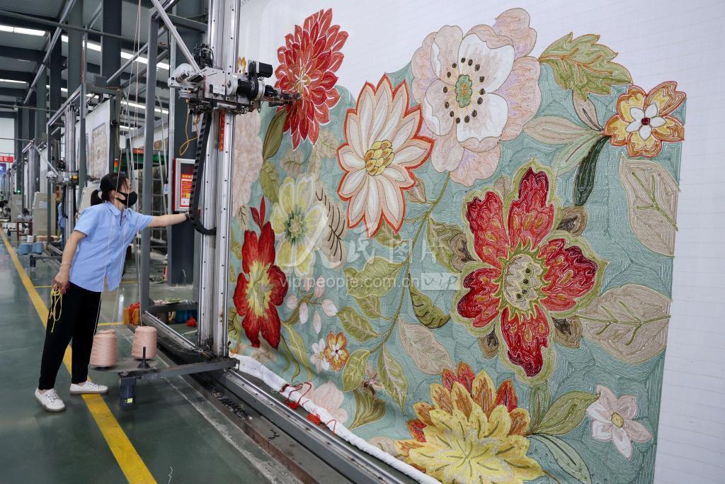 2023年5月27日,在山东省滨州市阳信县的一家地毯生产企业车间内,工人加紧赶制订单产品。