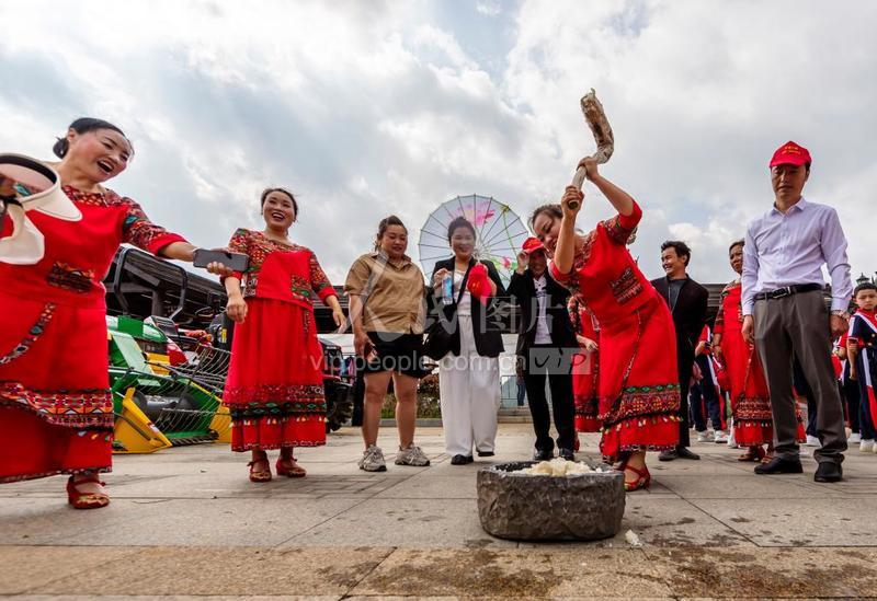 2023年5月28日,村民在贵州省毕节市百里杜鹃管理区黄泥乡朝门村打糍粑。