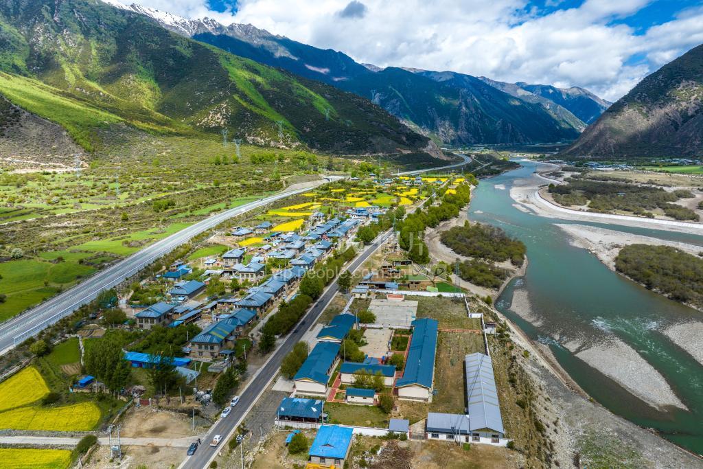 2023年5月28日,无人机视角下的西藏林芝市工布江达县江达乡朗村,黄色的油菜花、青色的青稞、特色的民居、穿行的公路与积雪山峰、蓝天白云相映成趣、景色秀美。
