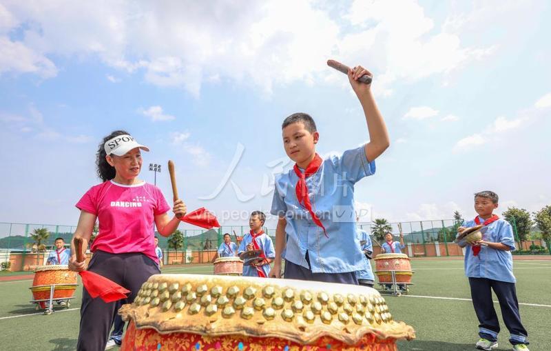 2023年5月30日,在贵州省黔东南苗族侗族自治州岑巩县羊桥土家族乡中心小学,民间艺人在指导学生敲击“思州战鼓”。