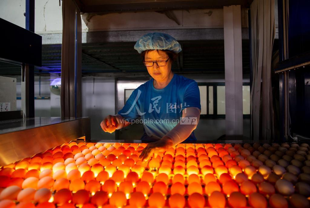 2023年5月30日,在江苏省海安市滨海新区的天成现代农业科技有限公司天晟牧园集蛋中心内,工人们正在智能化生产线上忙着分拣新鲜的鸡蛋。