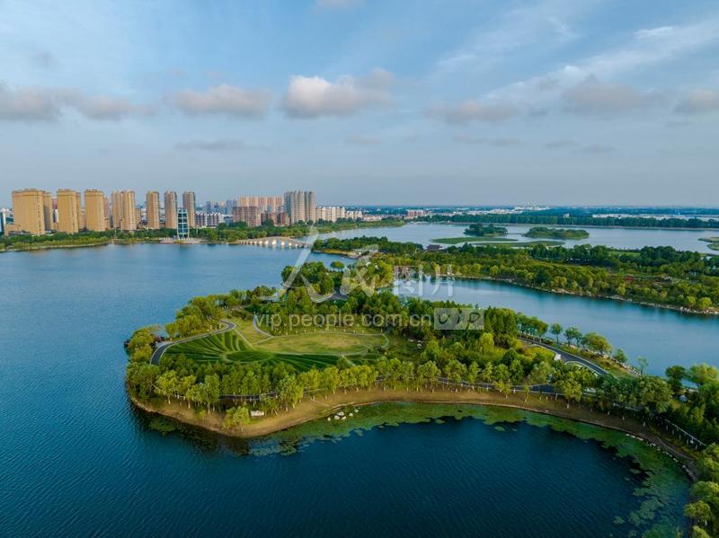 2023年5月31日,江苏省连云港市东海县西双湖湿地公园,岸绿水清,天蓝景美,人和鸟欢,处处郁郁葱葱,风景如画。