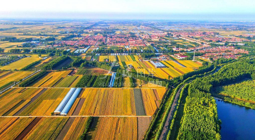 2023年5月31日,山东省青岛市即墨区的冬小麦进入成熟期,金色的小麦与道路、树木、村庄交相辉映,构成一幅美丽的丰收画卷。