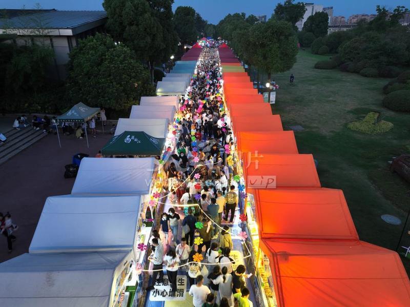 2023年6月1日,游客在江苏省扬州市花都汇生态公园的夜市休闲游玩。江苏省扬州市结合本地特色资源,建设更加完备的基础设施,同时鼓励夜间餐饮、旅游、文化娱乐等消费活动,持续激发夜间消费潜能,促进经济发展。